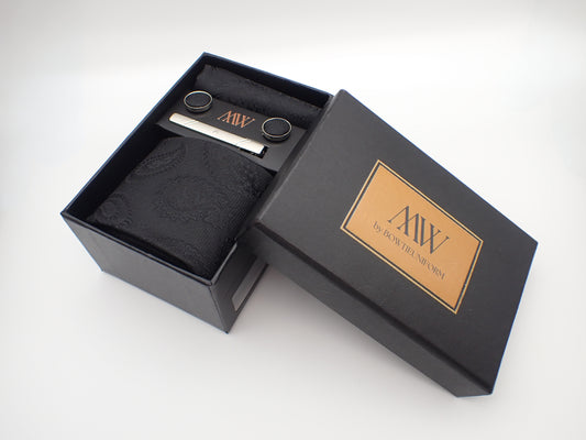 Chrysanthemum Black Tie Set / Pocket Square, Bowtie, Tie Clip, Cufflinks / Gift for Him / Wedding Groomsmen Gift / Men's Gift Box