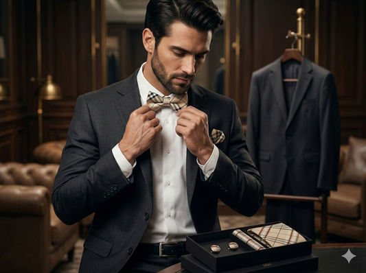 Gold Square Pattern Tie Set / Pocket Square, Bowtie, Tie Clip, Cufflinks / Gift for Him / Wedding Groomsmen Gift / Men's Present / Box
