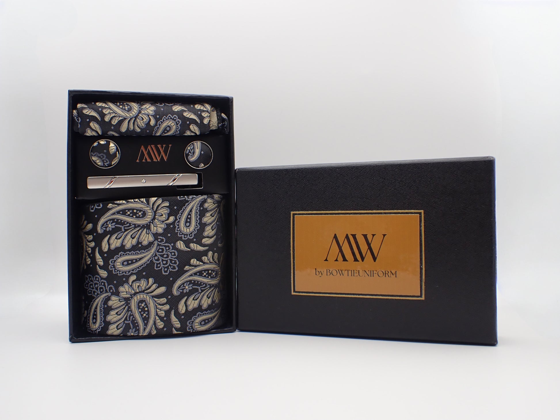 Our tie set including a Tie, Pocket Square, Bowtie, Cufflinks and Clips which also comes with a box.
