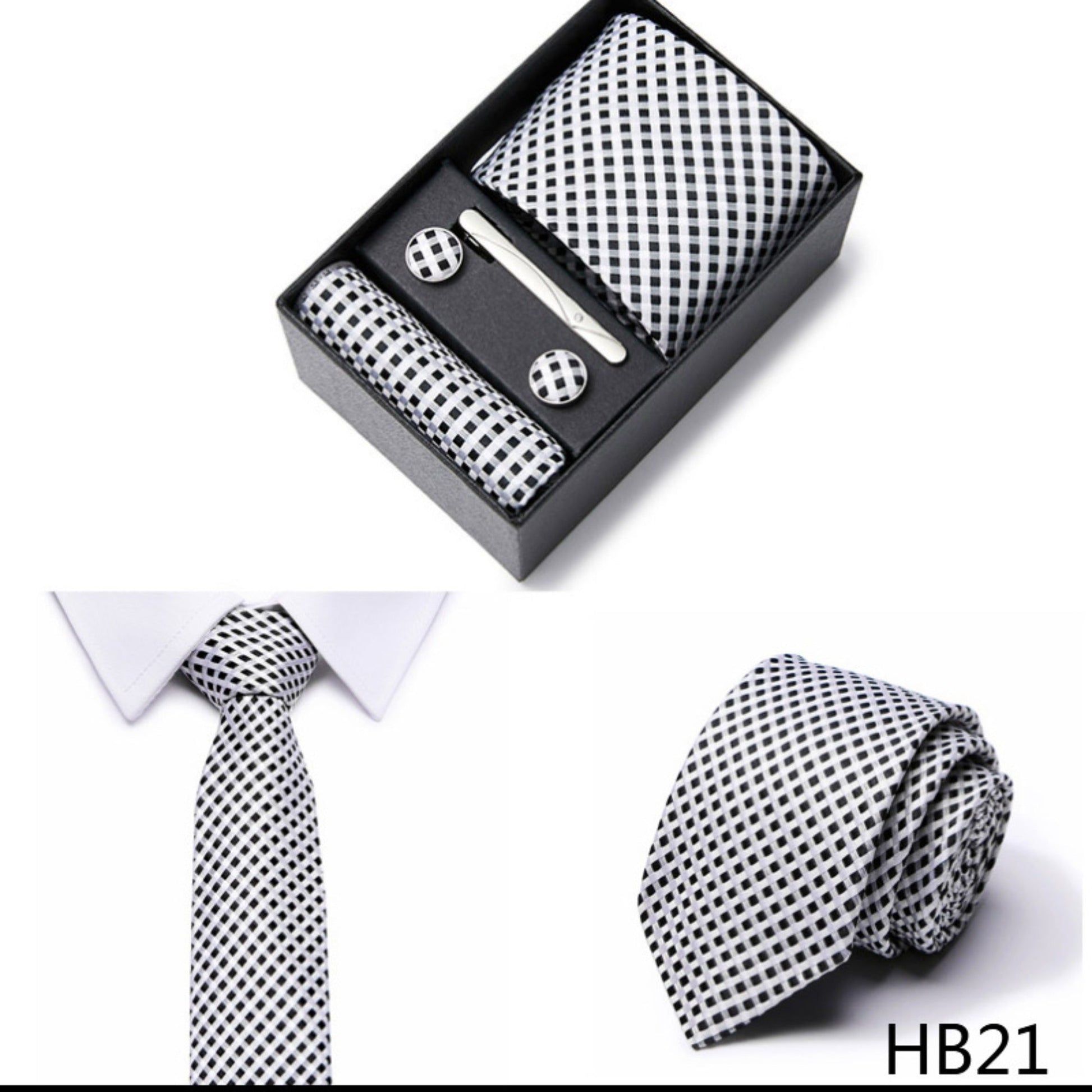 Our tie set including a Tie, Pocket Square, Bowtie, Cufflinks and Clips which also comes with a box.
