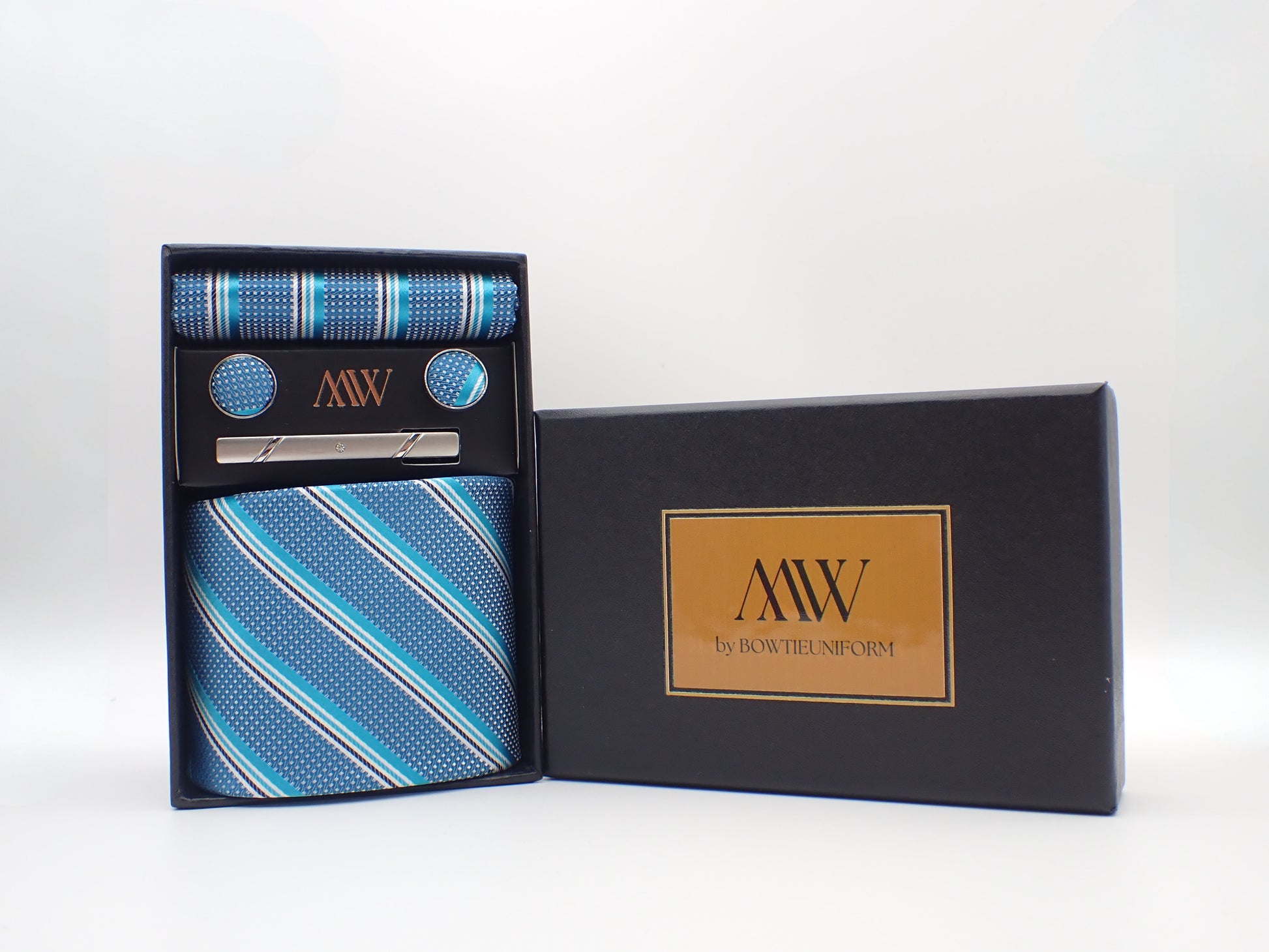 Our tie set including a Tie, Pocket Square, Bowtie, Cufflinks and Clips which also comes with a box.