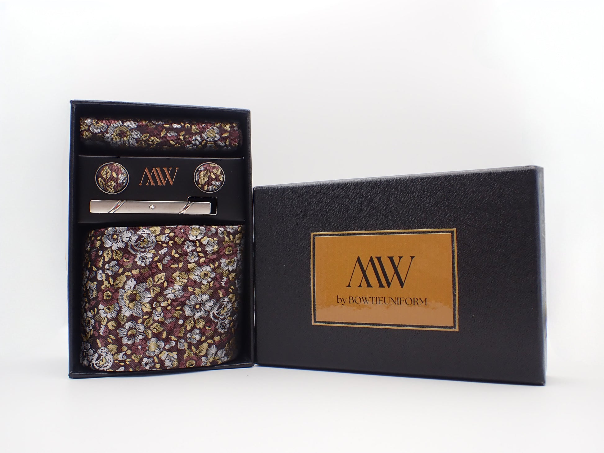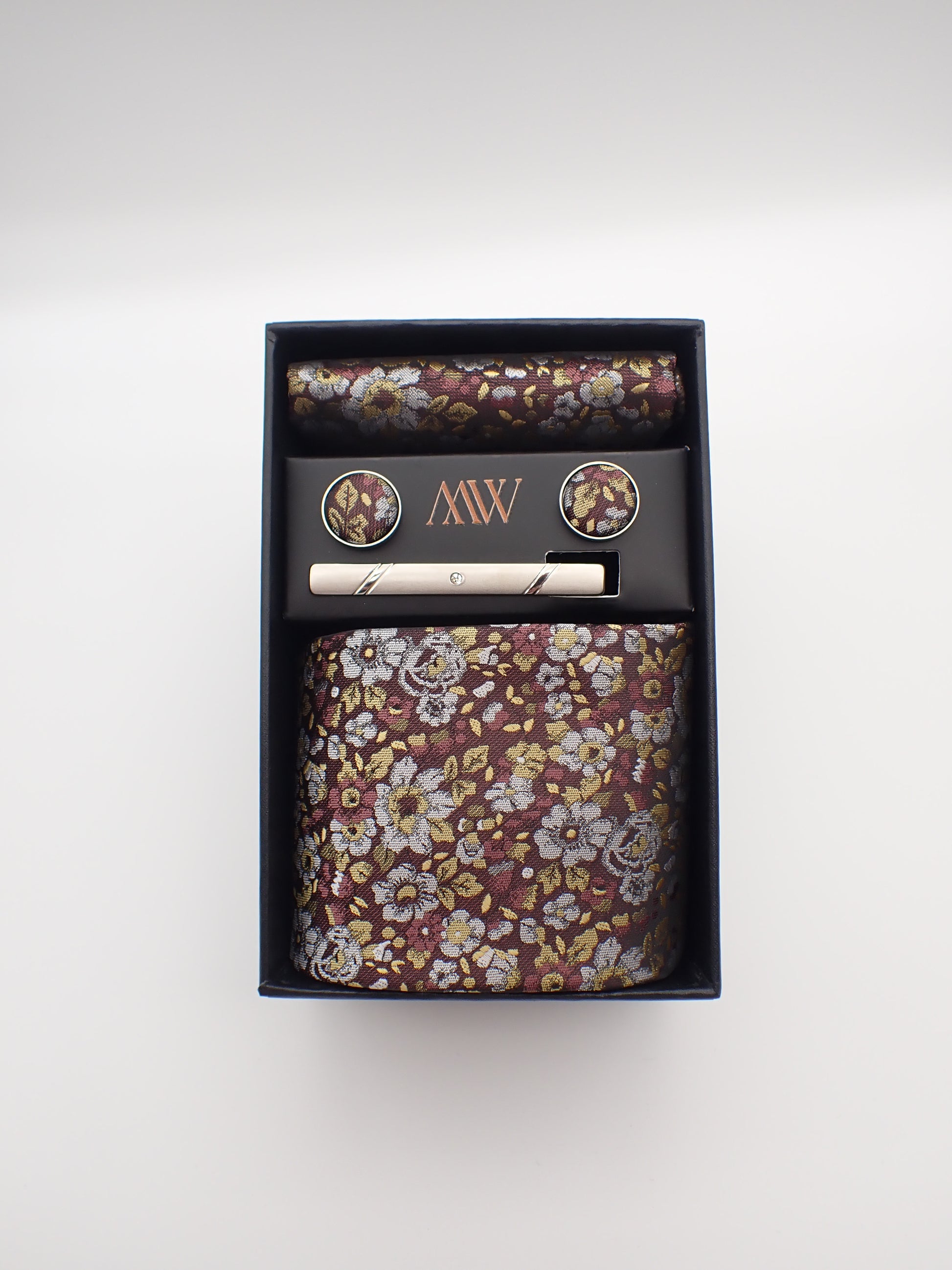 Our tie set including a Tie, Pocket Square, Bowtie, Cufflinks and Clips which also comes with a box.
