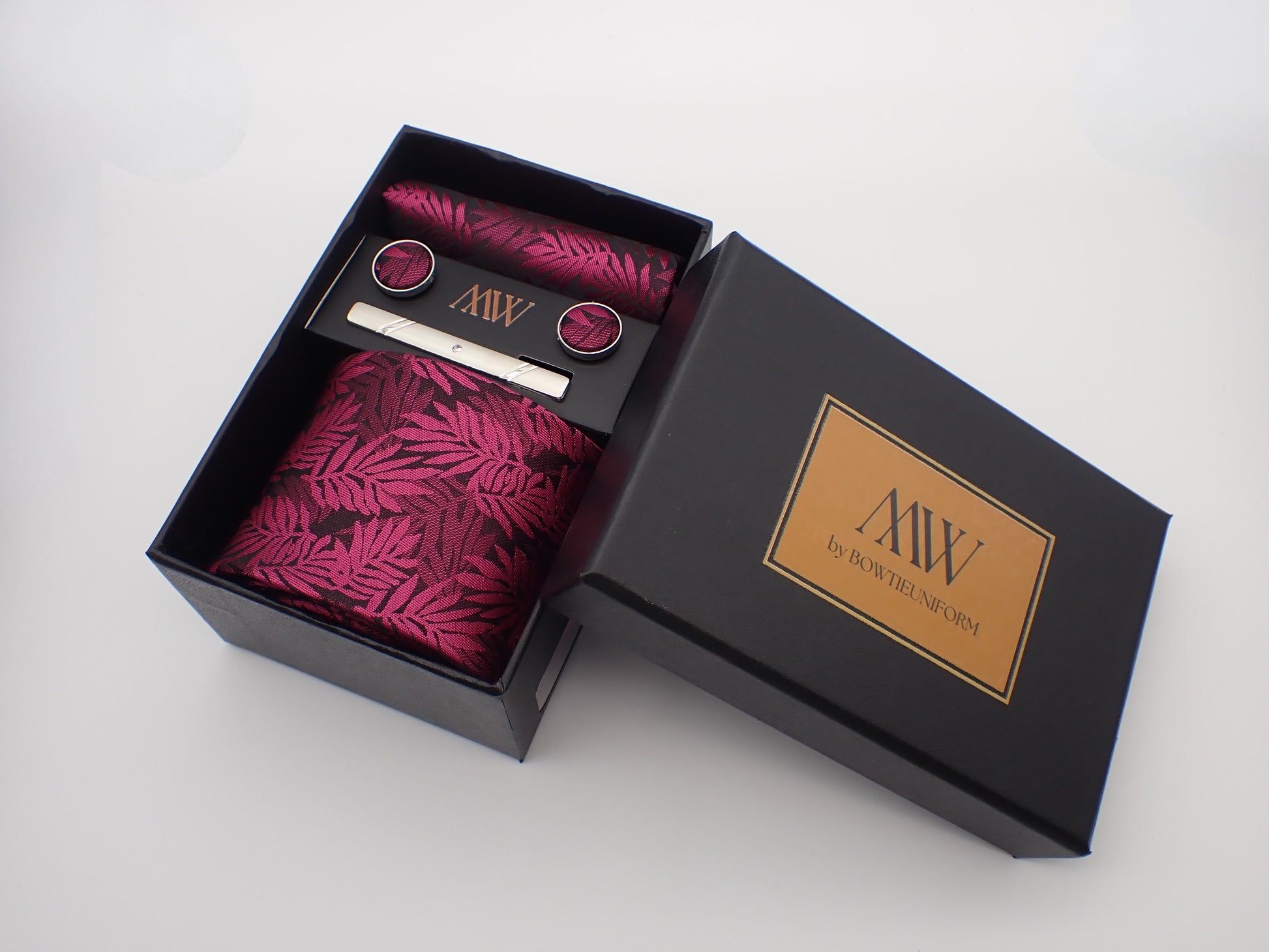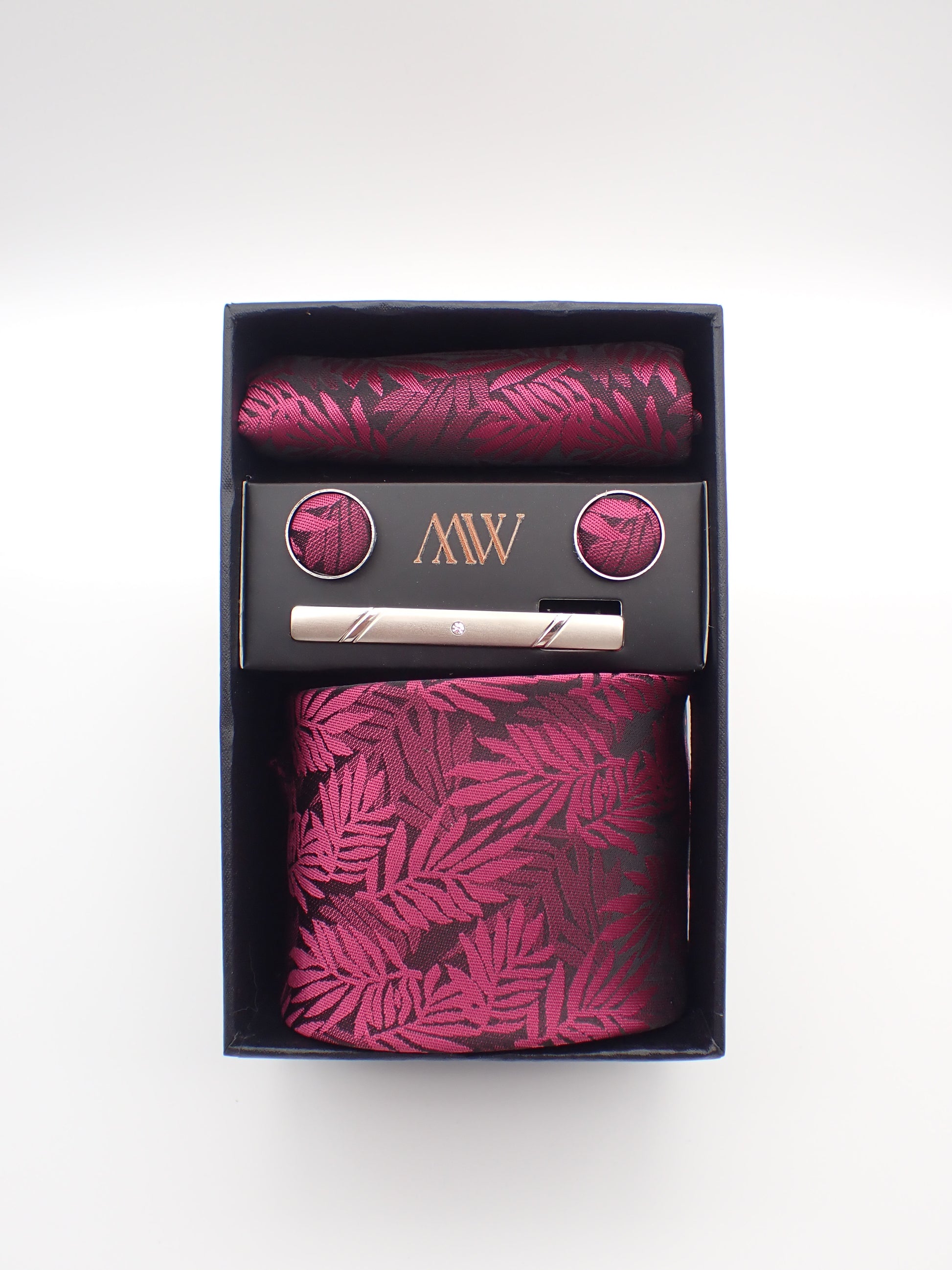 Our tie set including a Tie, Pocket Square, Bowtie, Cufflinks and Clips which also comes with a box.