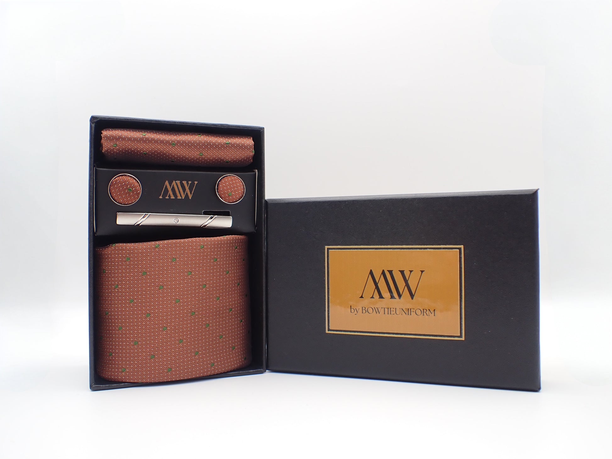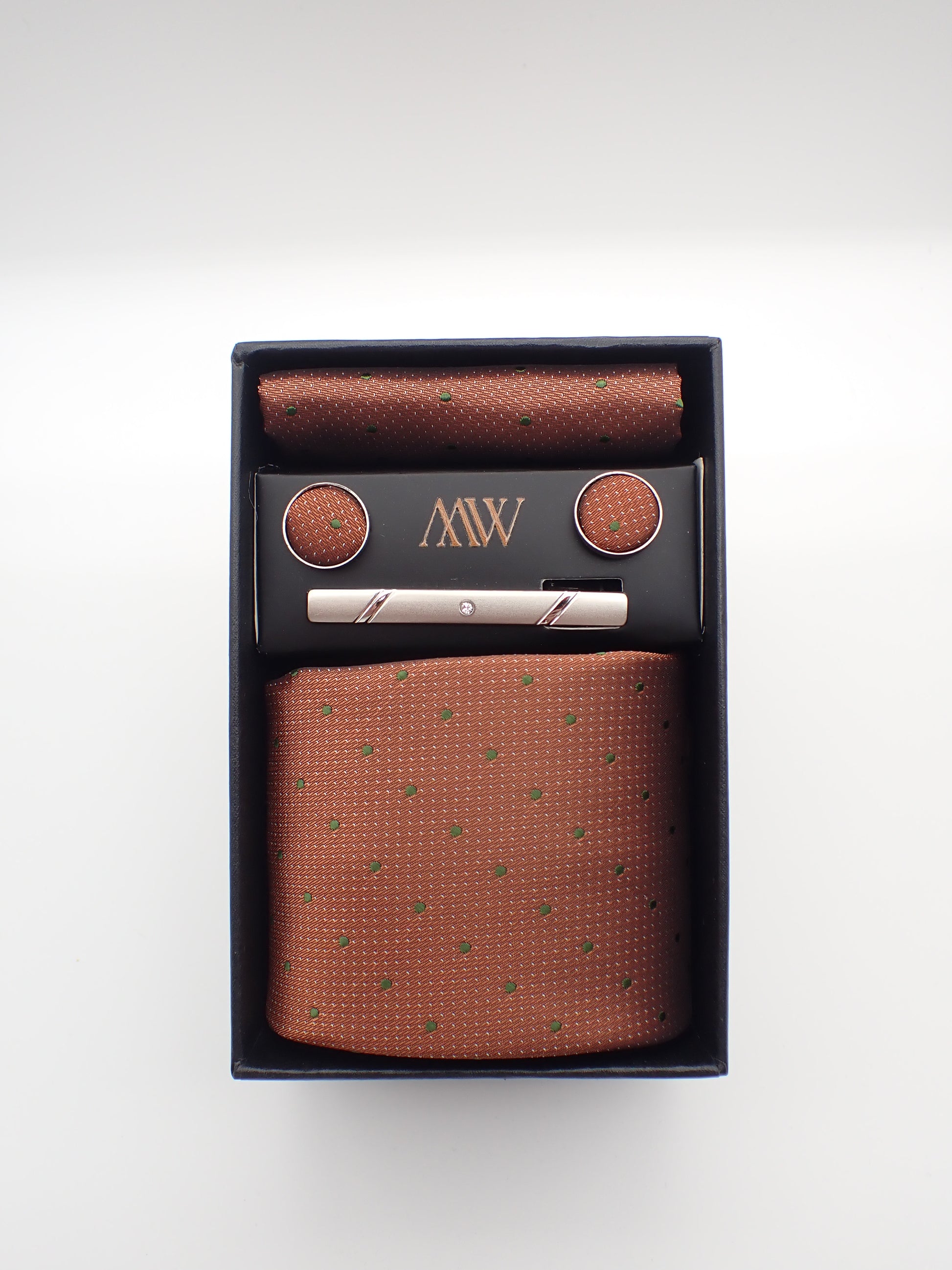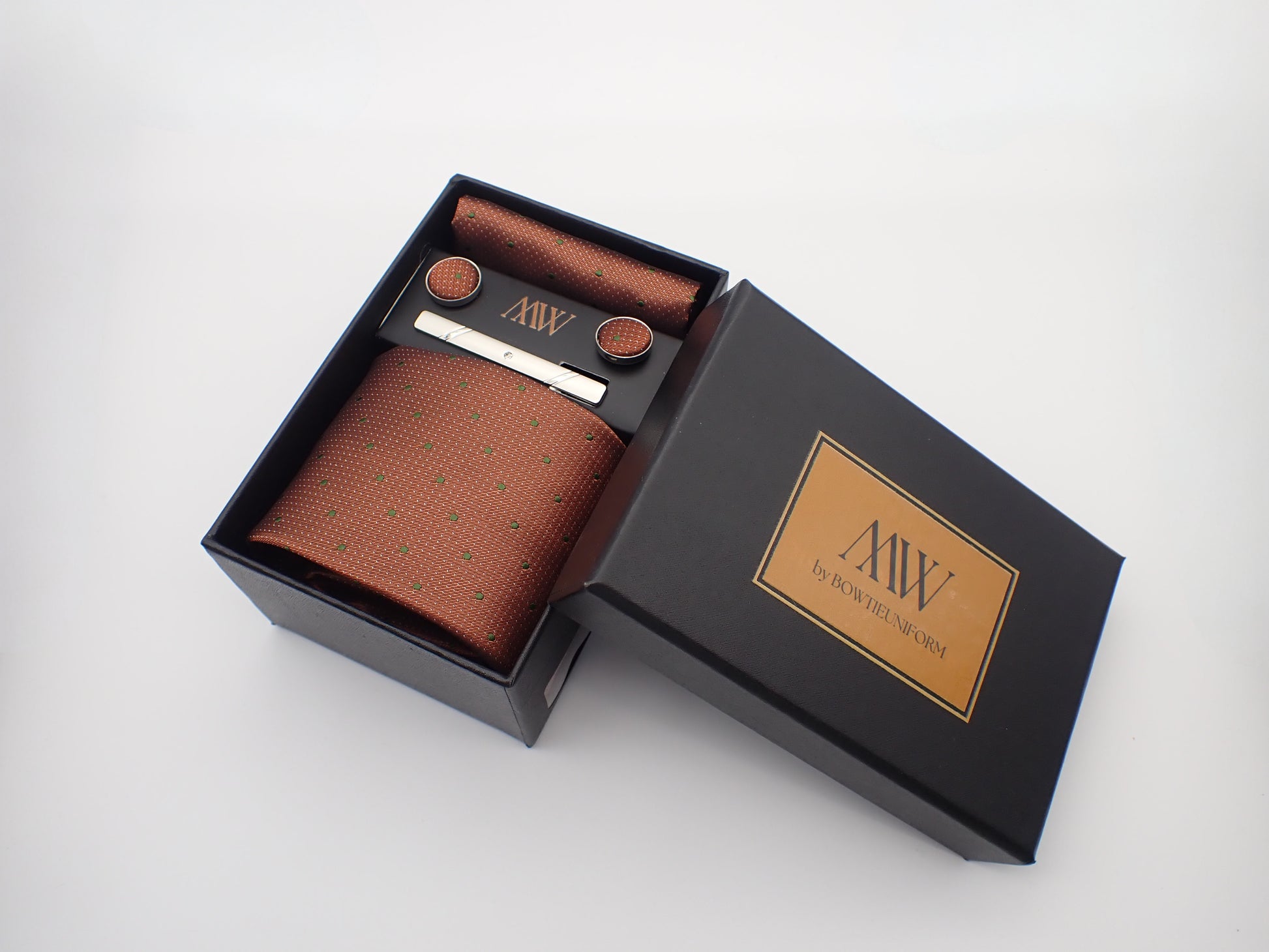 Our tie set including a Tie, Pocket Square, Bowtie, Cufflinks and Clips which also comes with a box.