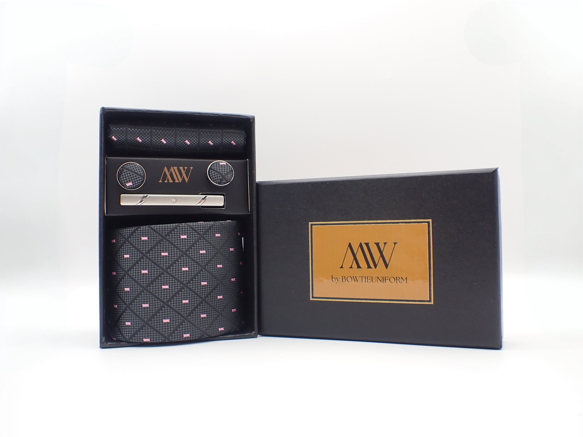 Our tie set including a Tie, Pocket Square, Bowtie, Cufflinks and Clips which also comes with a box.