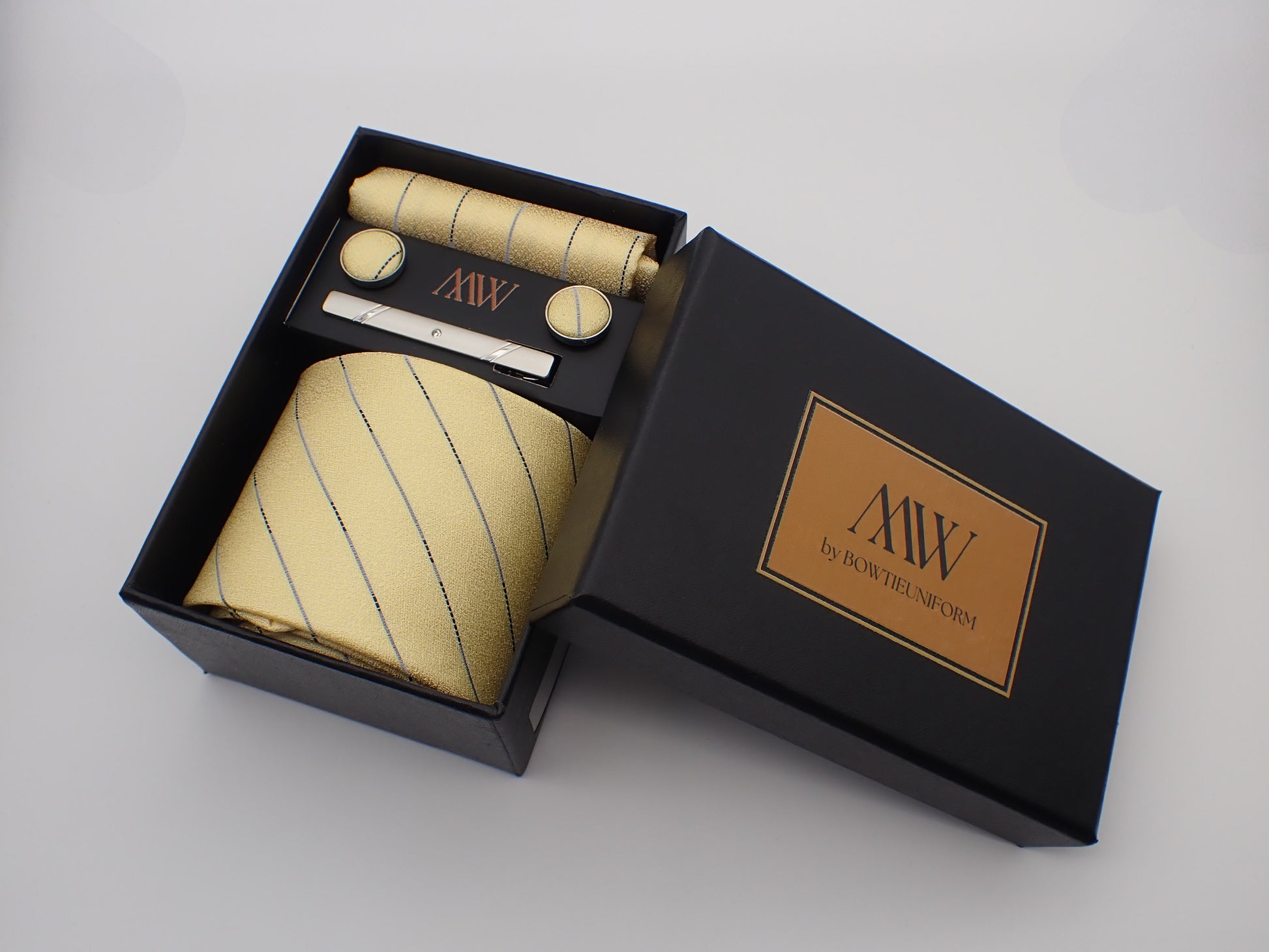 Our tie set including a Tie, Pocket Square, Bowtie, Cufflinks and Clips which also comes with a box.