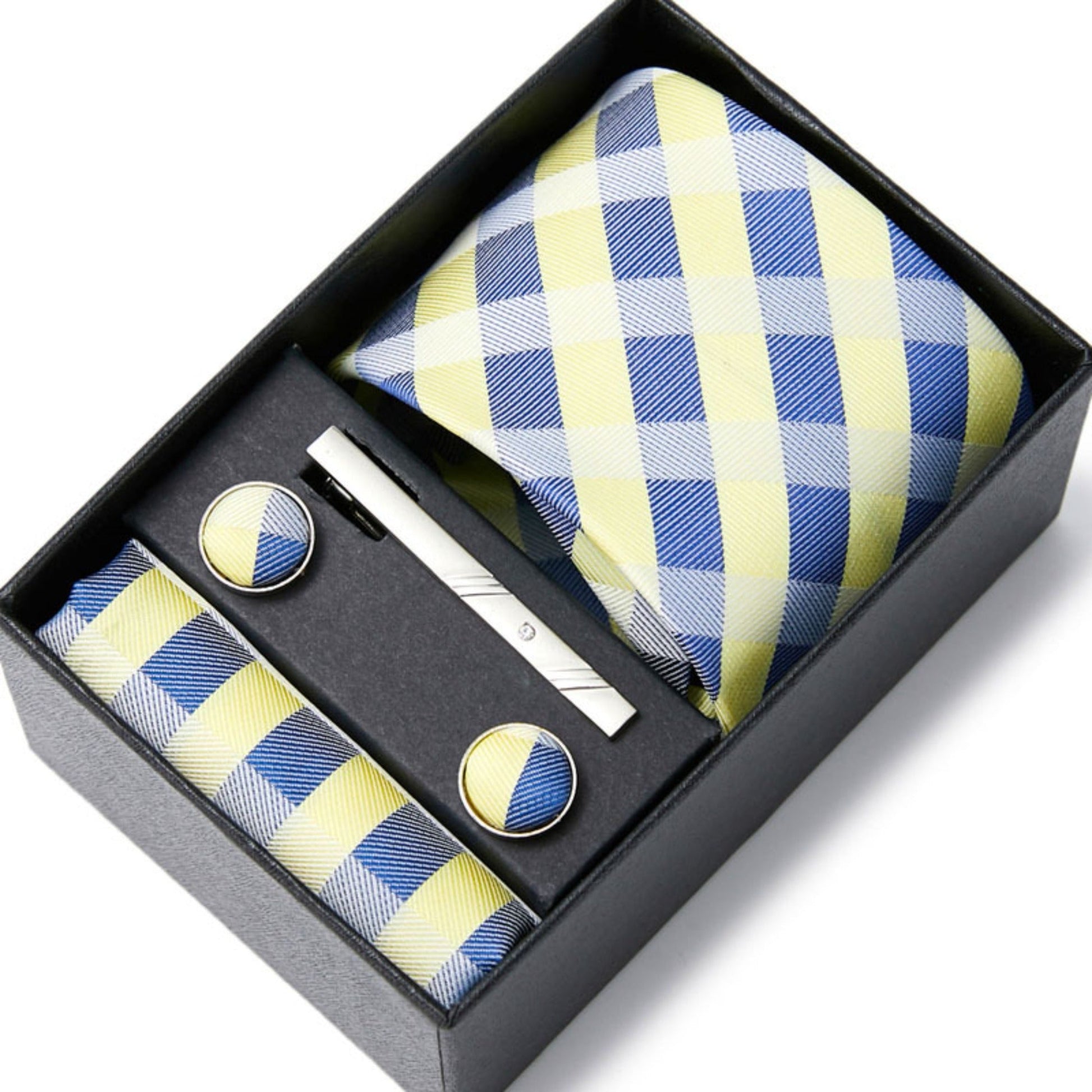 Our tie set including a Tie, Pocket Square, Bowtie, Cufflinks and Clips which also comes with a box.