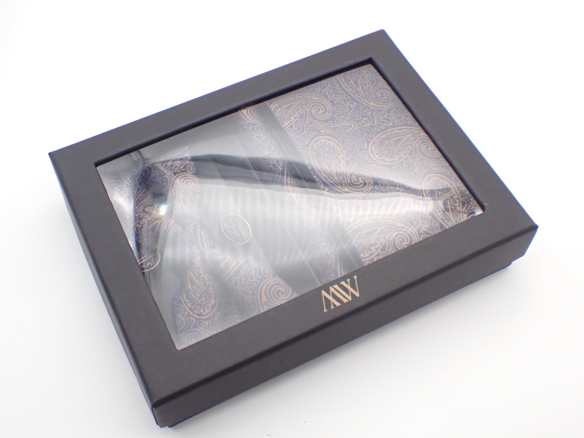 Our tie set including a Tie, Pocket Square, Bowtie, Cufflinks and Clips which also comes with a box.