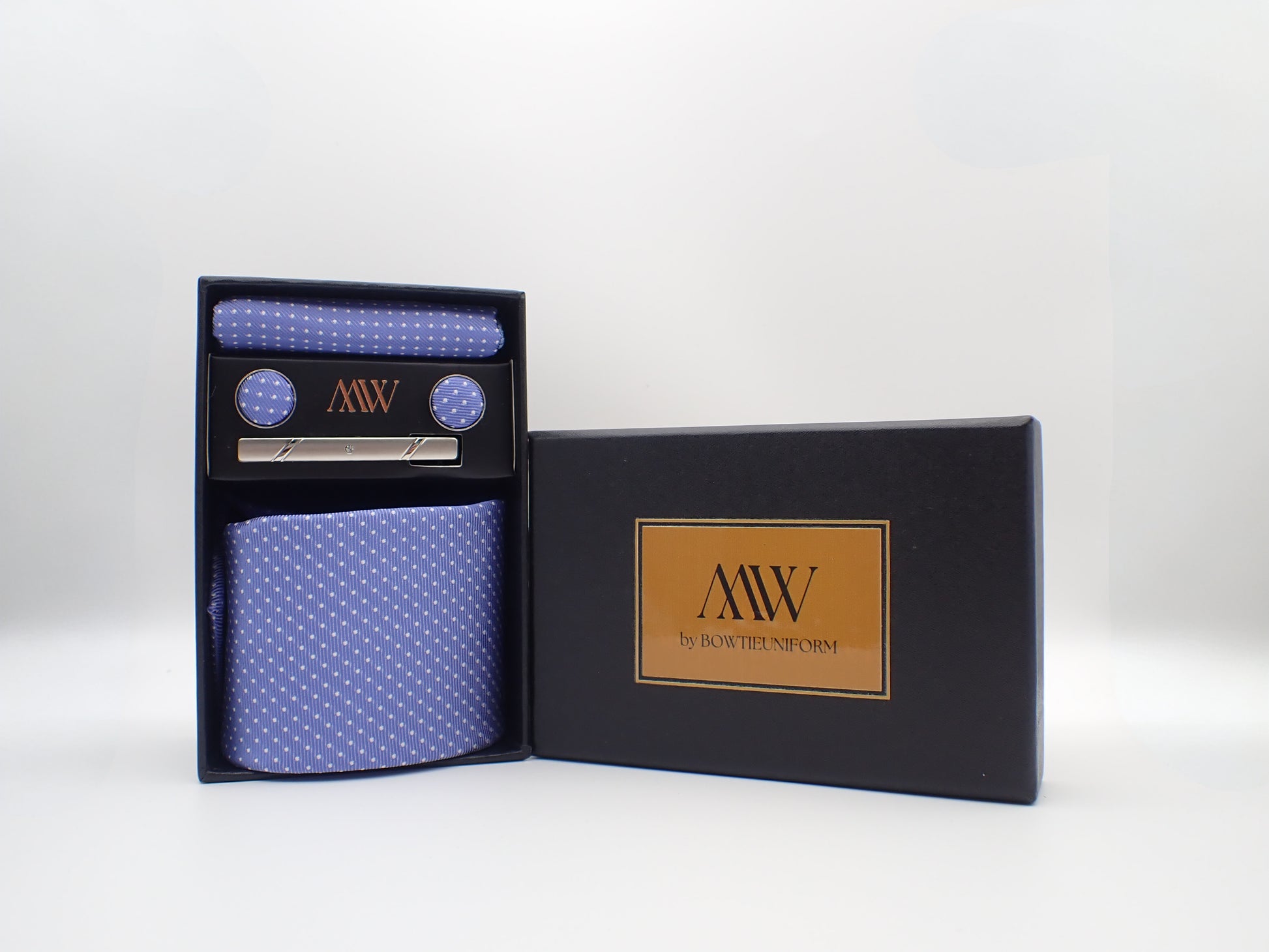 Our tie set including a Tie, Pocket Square, Bowtie, Cufflinks and Clips which also comes with a box.