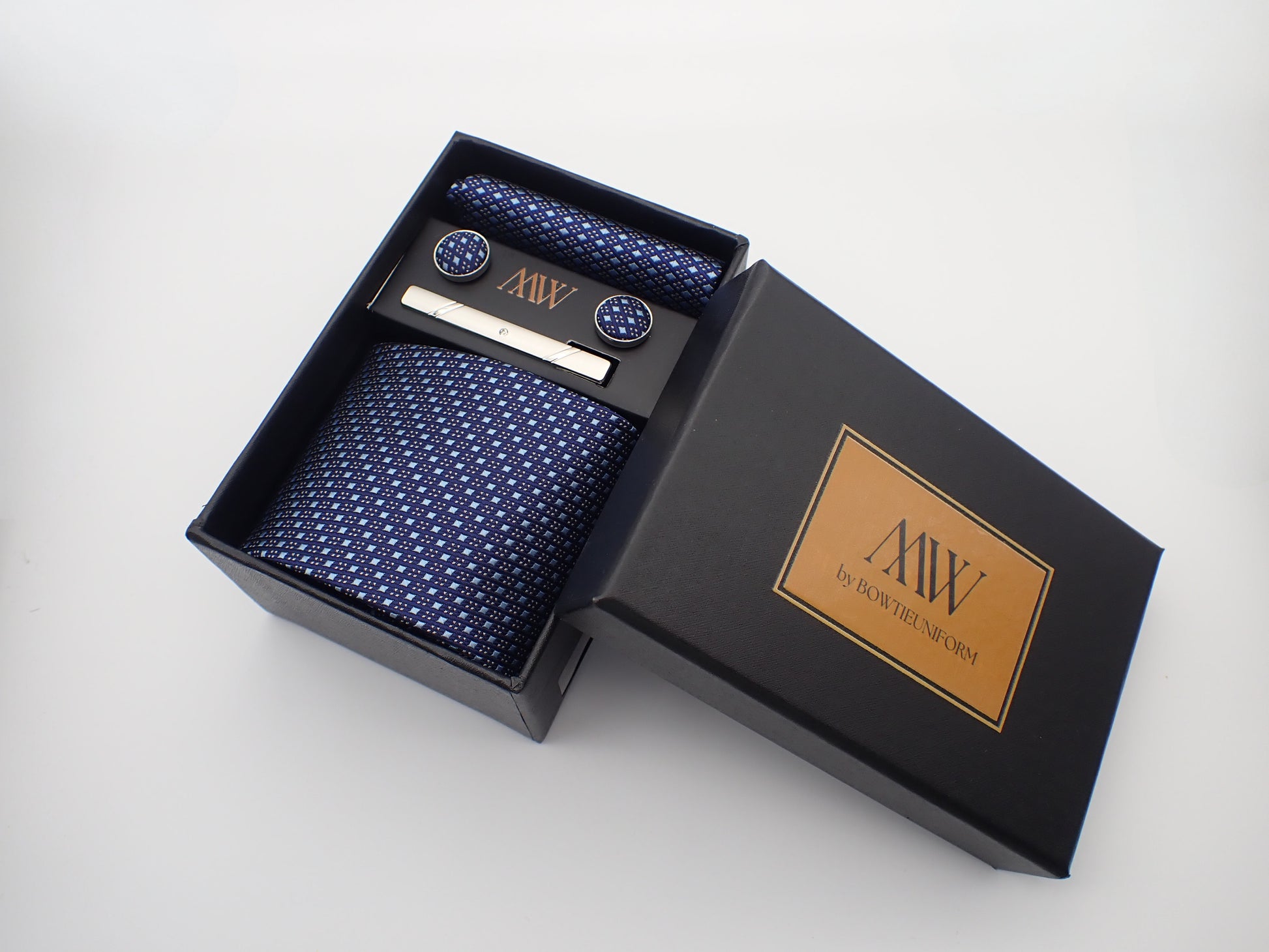 Our tie set including a Tie, Pocket Square, Bowtie, Cufflinks and Clips which also comes with a box.