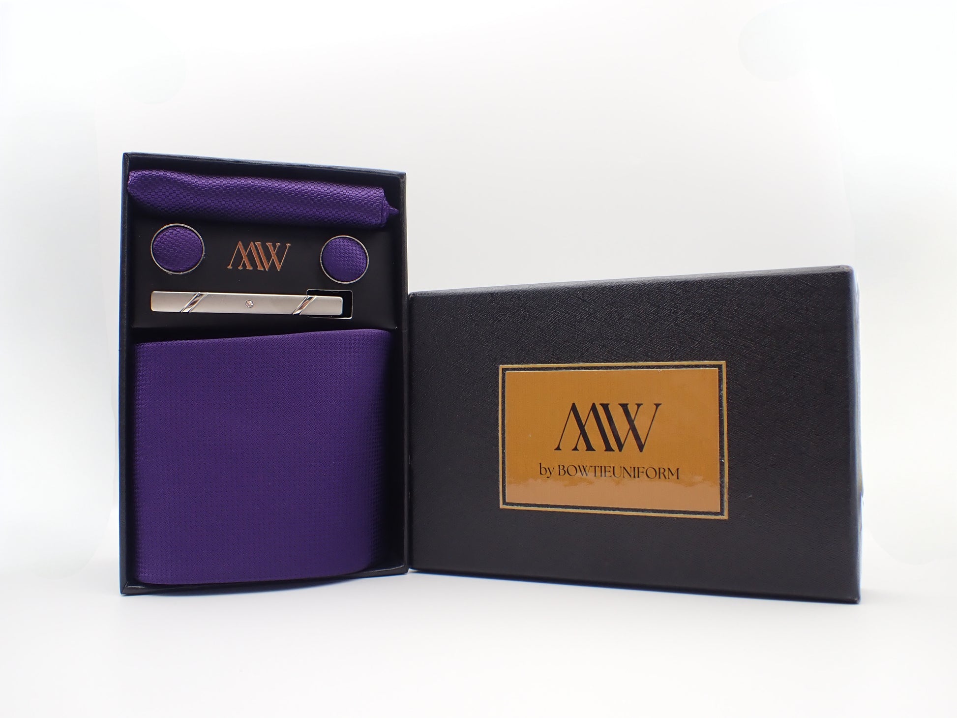Our tie set including a Tie, Pocket Square, Bowtie, Cufflinks and Clips which also comes with a box.
