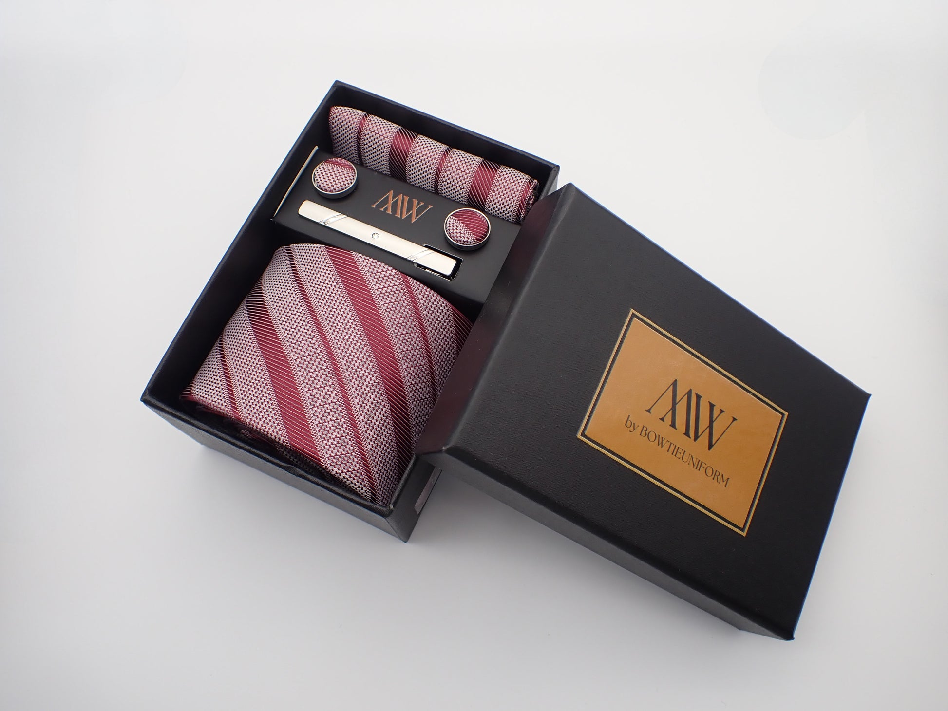 Our tie set including a Tie, Pocket Square, Bowtie, Cufflinks and Clips which also comes with a box.