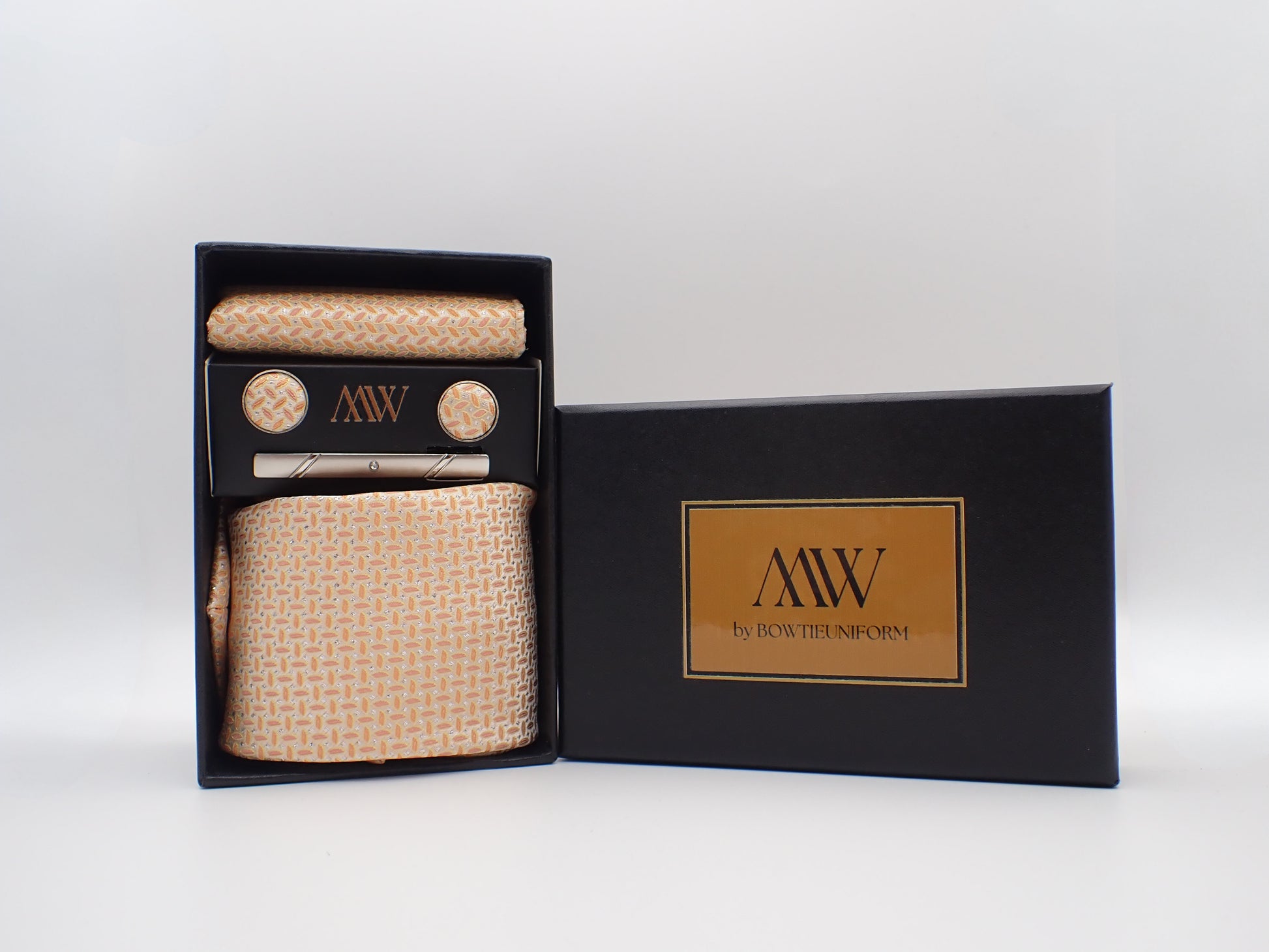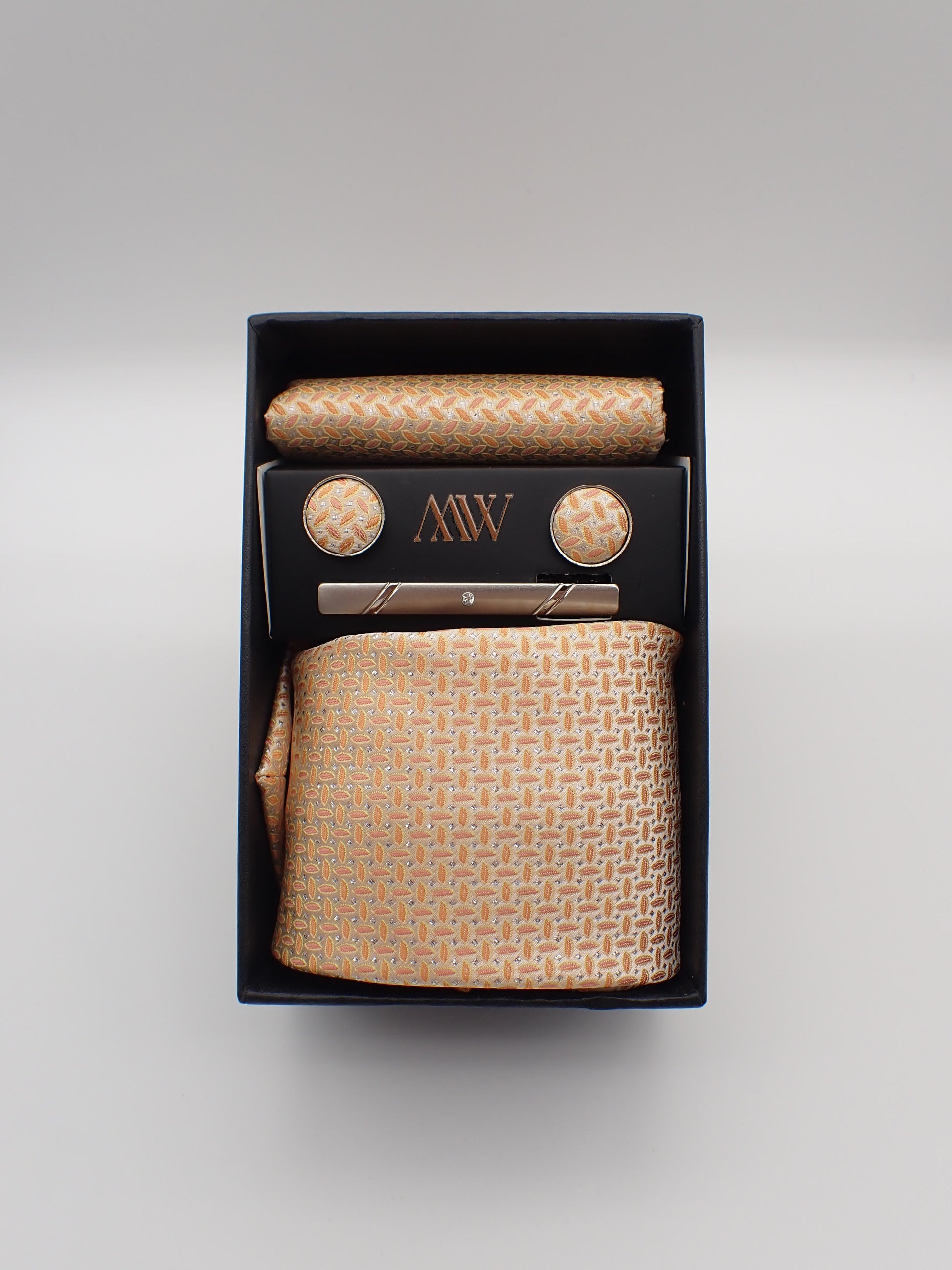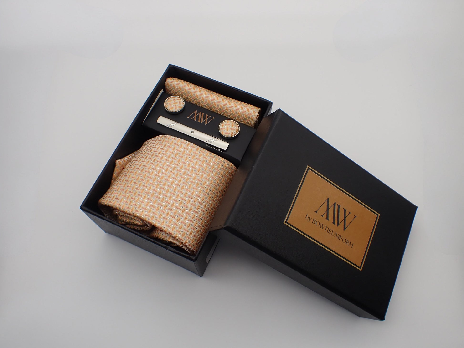 Our tie set including a Tie, Pocket Square, Bowtie, Cufflinks and Clips which also comes with a box.