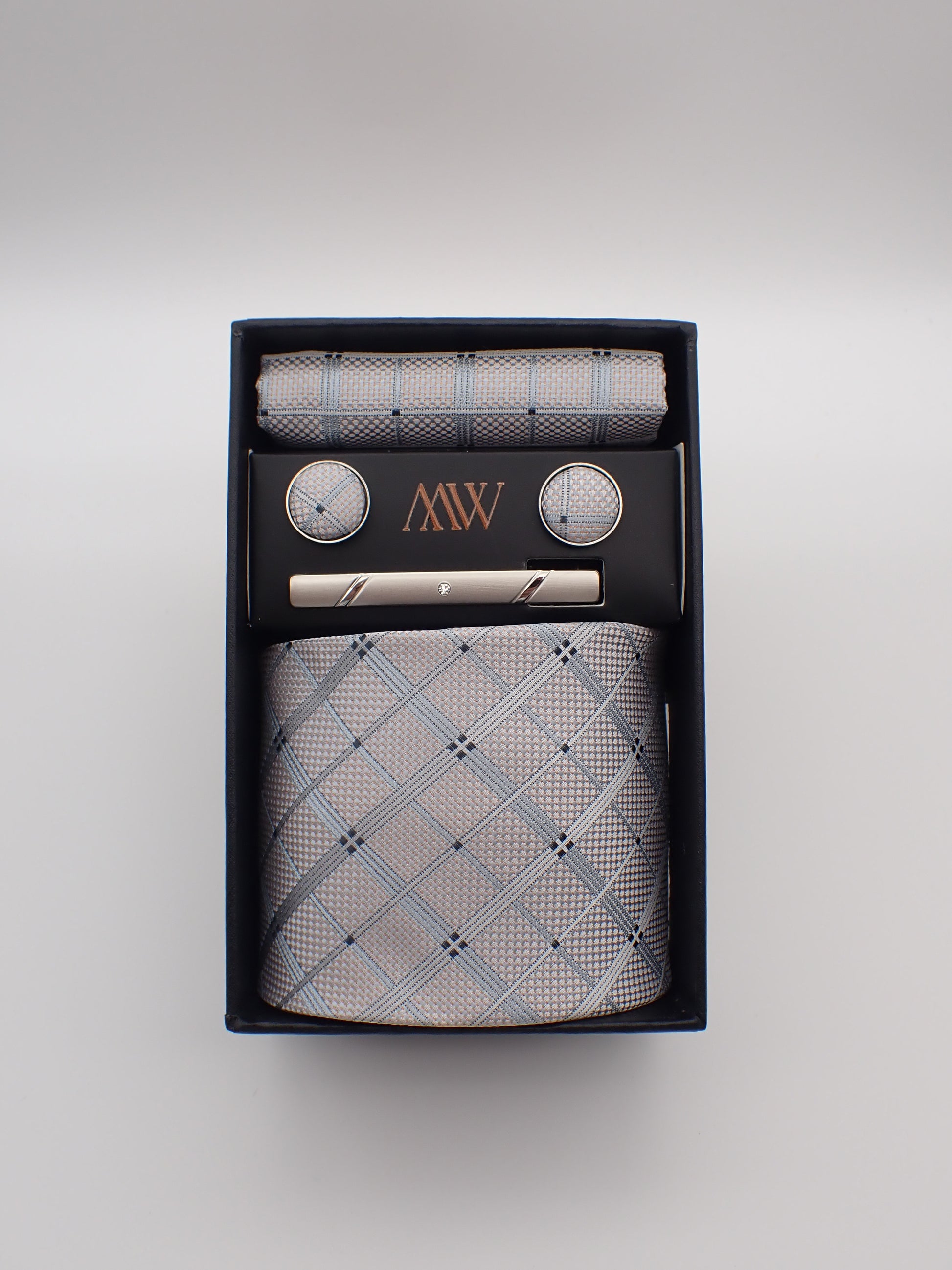 Our tie set including a Tie, Pocket Square, Bowtie, Cufflinks and Clips which also comes with a box.